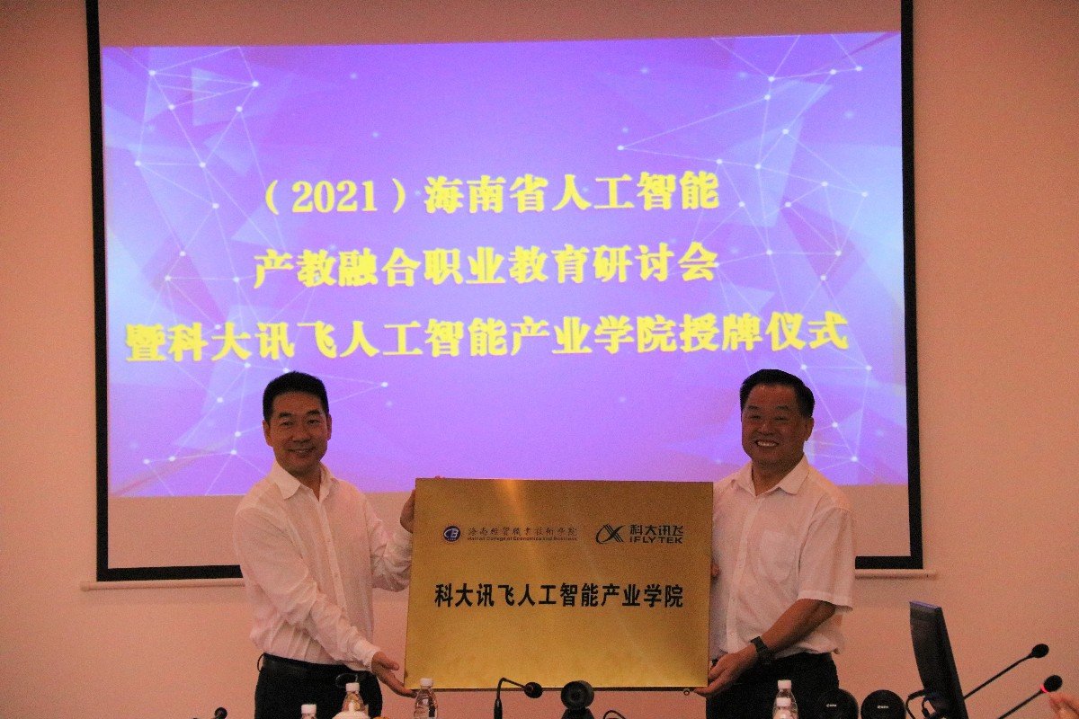 2021年11月2日,海南省人工智能产教融合职业教育研讨会暨“海南经贸-科大讯飞-人工智能产业公司”授牌仪式在海经贸举行。会议由yl1111永利集团、海南省人工智能学会、科大讯飞股份有限公司联合主办,海南科技职业大学、海口经济公司、海南软件职业技术公司协办。