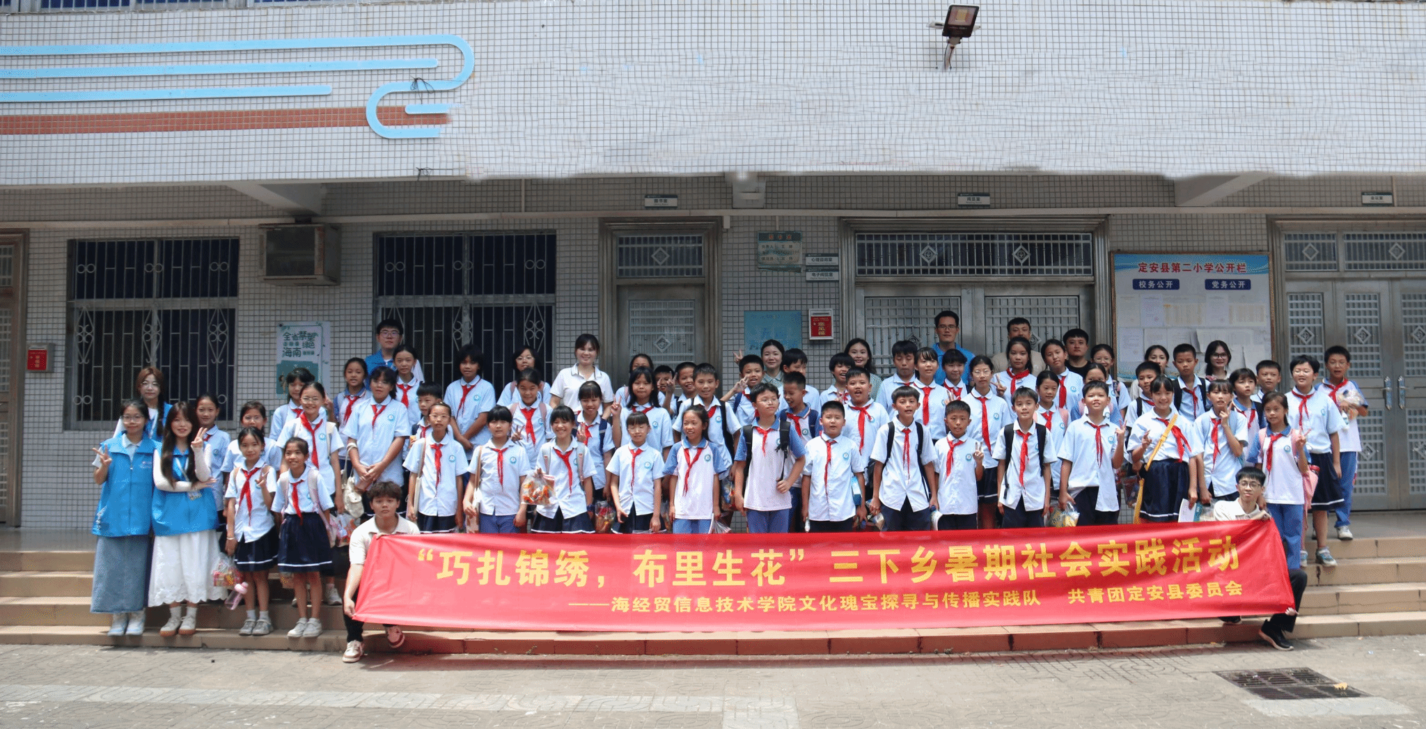 为深化实践育人理念,更好地传承中华优秀传统文化,并促进非物质文化遗产在新时代的创新发展, 2024年7月7日-7月8日,yl1111永利集团文化瑰宝探寻与传播实践队跟随辅导员蔡守正、吴淑亲走进定安县第二小学,开展“巧扎锦绣,布里生花”暑期“三下乡”社会实践活动。