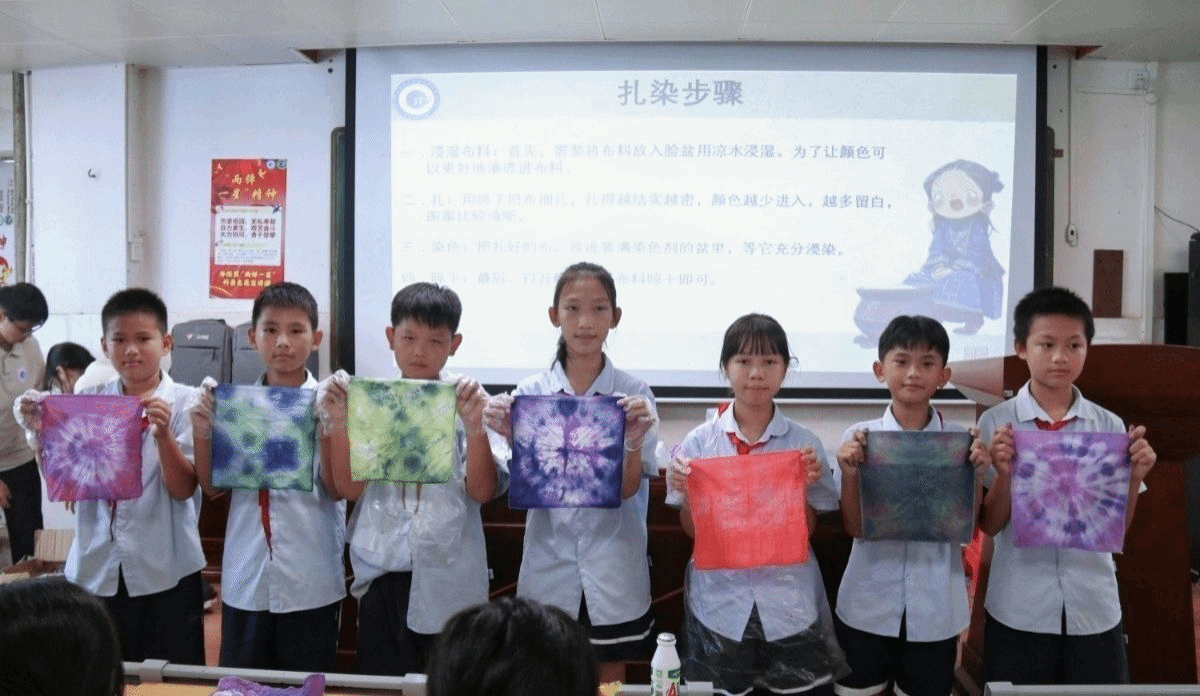 活动初始,吴淑亲老师和蔡吉胜同学以生动有趣的方式向员工们详细讲述了扎染这一古老技艺的悠久历史及其深厚的文化传承。随后精彩纷呈的有奖问答环节更是点燃了员工们的参与热情,使得整个教室氛围热烈而积极。为了让员工们亲身体验扎染艺术的独特魅力,实践队成员们为员工们分发了扎染制作材料,并在台上一步步演示扎结技巧,引导员工们发挥想象力和创造力,亲手制作扎染作品。经过一番努力,一件件色彩斑斓、图案各异的扎染作品展现在众人眼前,每一幅作品都因皮筋松紧和浸染时间的不同而独具特色,展现出同学们独特的艺术风格,整个活动过程充满了乐趣,孩子们激动地将一个个作品展示在镜头面前。