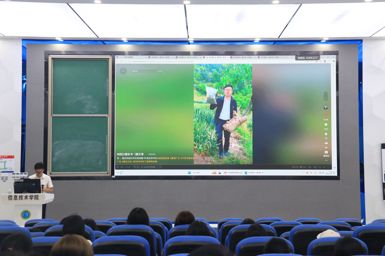 最触动现场的是谢艾军归乡四年的乡村振兴实践。作为四川苍溪兴华村党支部书记,他展示了通过抖音直播带货实现农产品年销售额200万元的案例,讲述发起“支书联盟”、推动基建项目的基层工作经历,播放的“稻田养鱼”助农短视频让师生直观感受乡村振兴的创新实践。