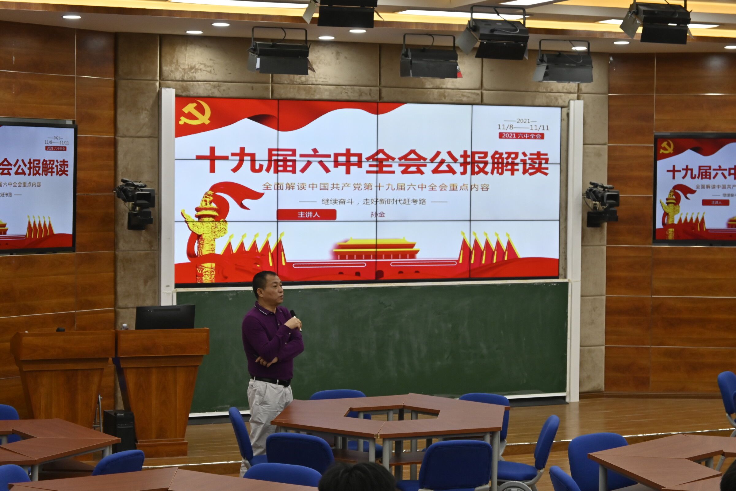 首先,孙金书记向全体同学解读本次六中全会的主要内容,主要包括十九届六中全会要文的基本概括,十九届六中全会公报解读,十九届六中全会到底有多重要等三方面内容,并详细的进行了逐一解读。