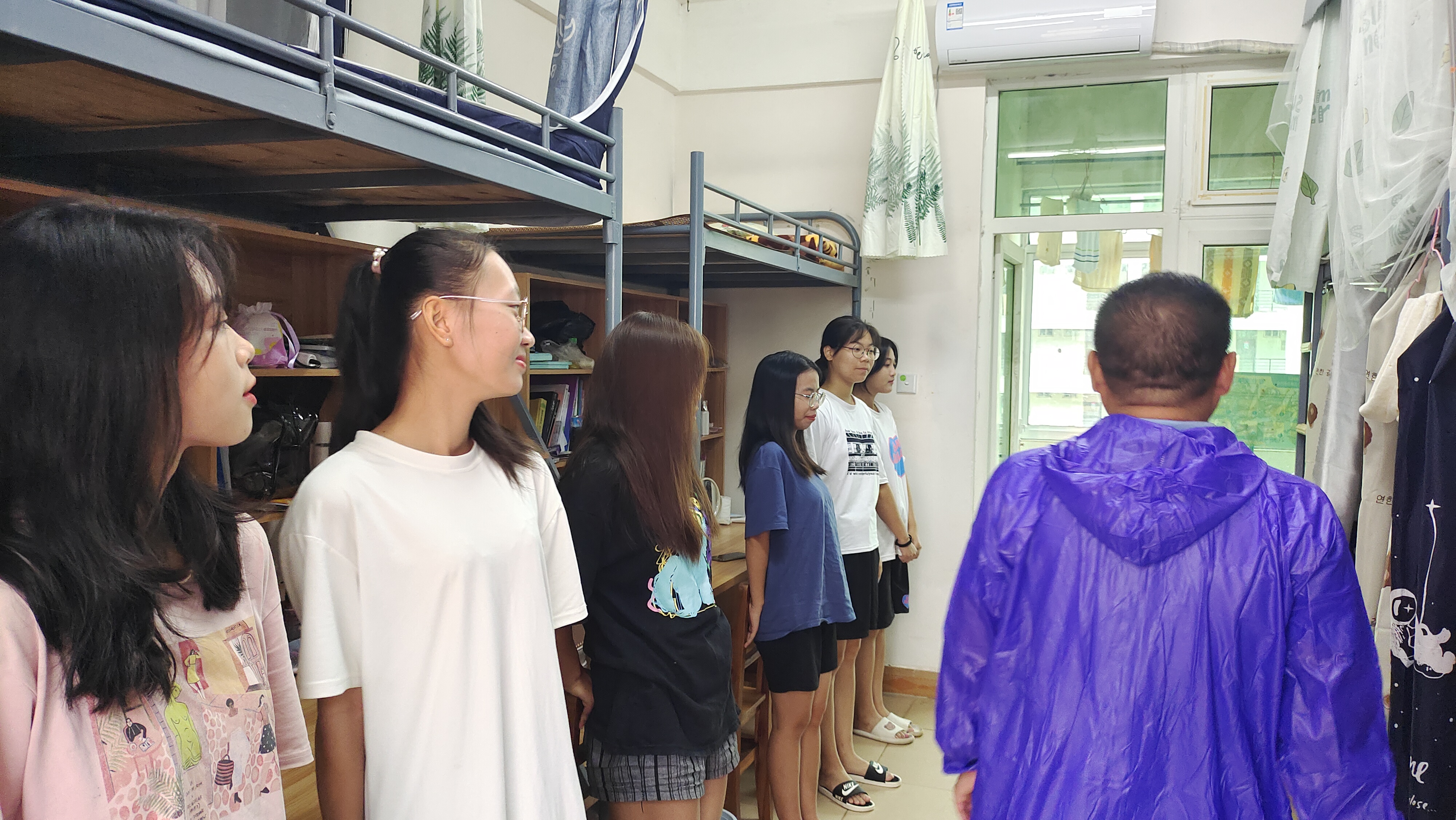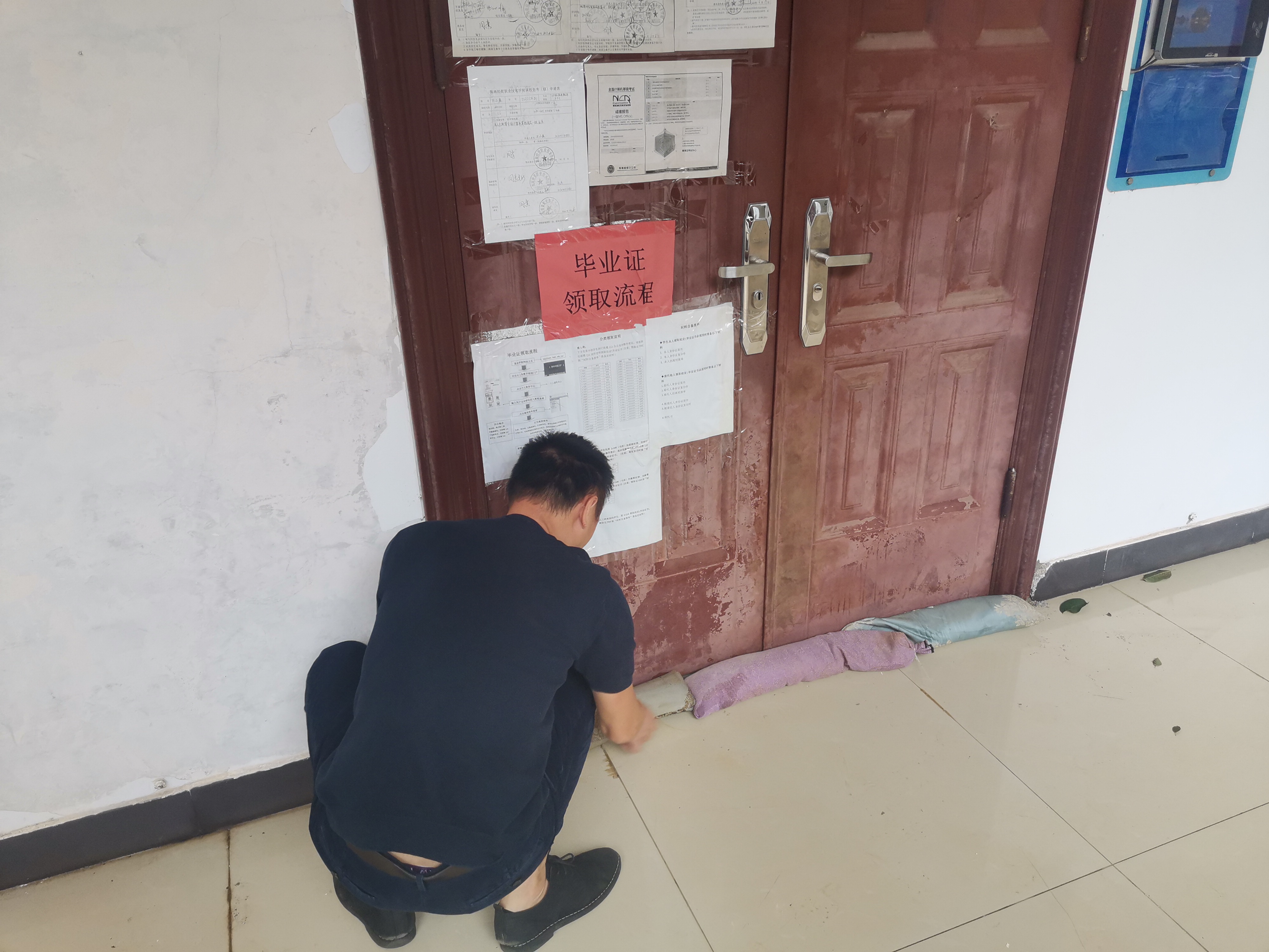 工作小组的每员成员在走访过程中一一提醒同学们提前屯粮、屯水,叮嘱每位员工都要注意预防风雨侵袭,关好宿舍门窗,保护自身安全,并对宿舍内部门窗、公共区域进行安全隐患排查。同时身处院办留守的老师也开始做好台风防御工作,包括公告栏易倒设备转移至安全地区、易涝教室堆叠沙袋防护等。