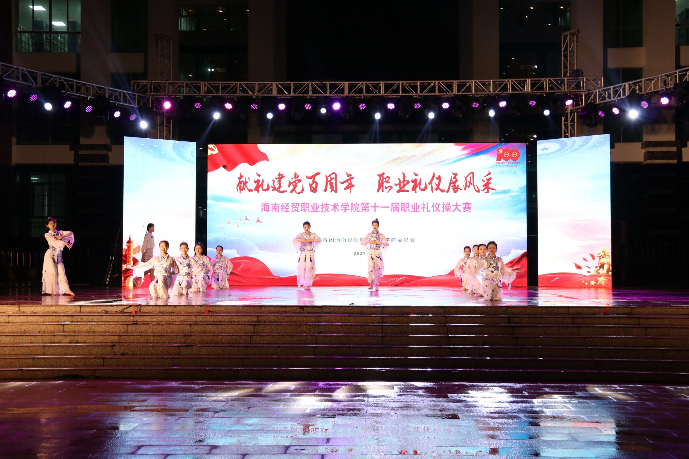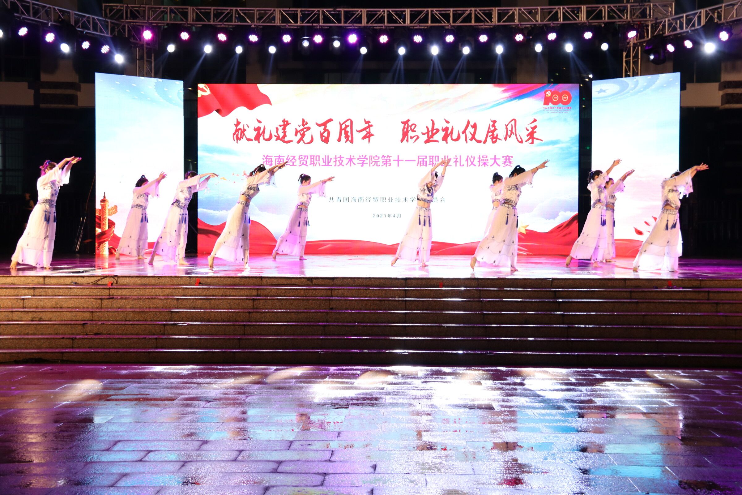 (2021年4月27日 青年媒体中心 黎扬振)讯。庆祝建党100周年,职业礼仪展风采,yl1111永利集团第十一届职业礼仪操大赛,于4月27日晚上7点在经贸广场如期举行。