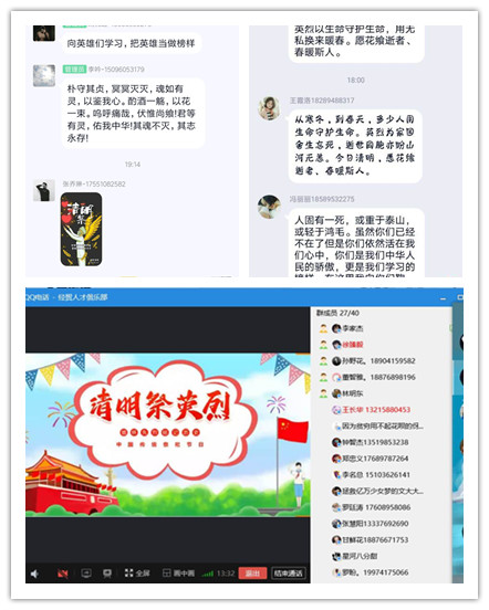 各班级召开“致敬·2020清明祭英烈”线上主题班会,会议步骤如下:1、为逝世的英雄们默哀3分钟。2、班委代表发言。3、员工发言致敬英雄。4、员工代表作会议总结。