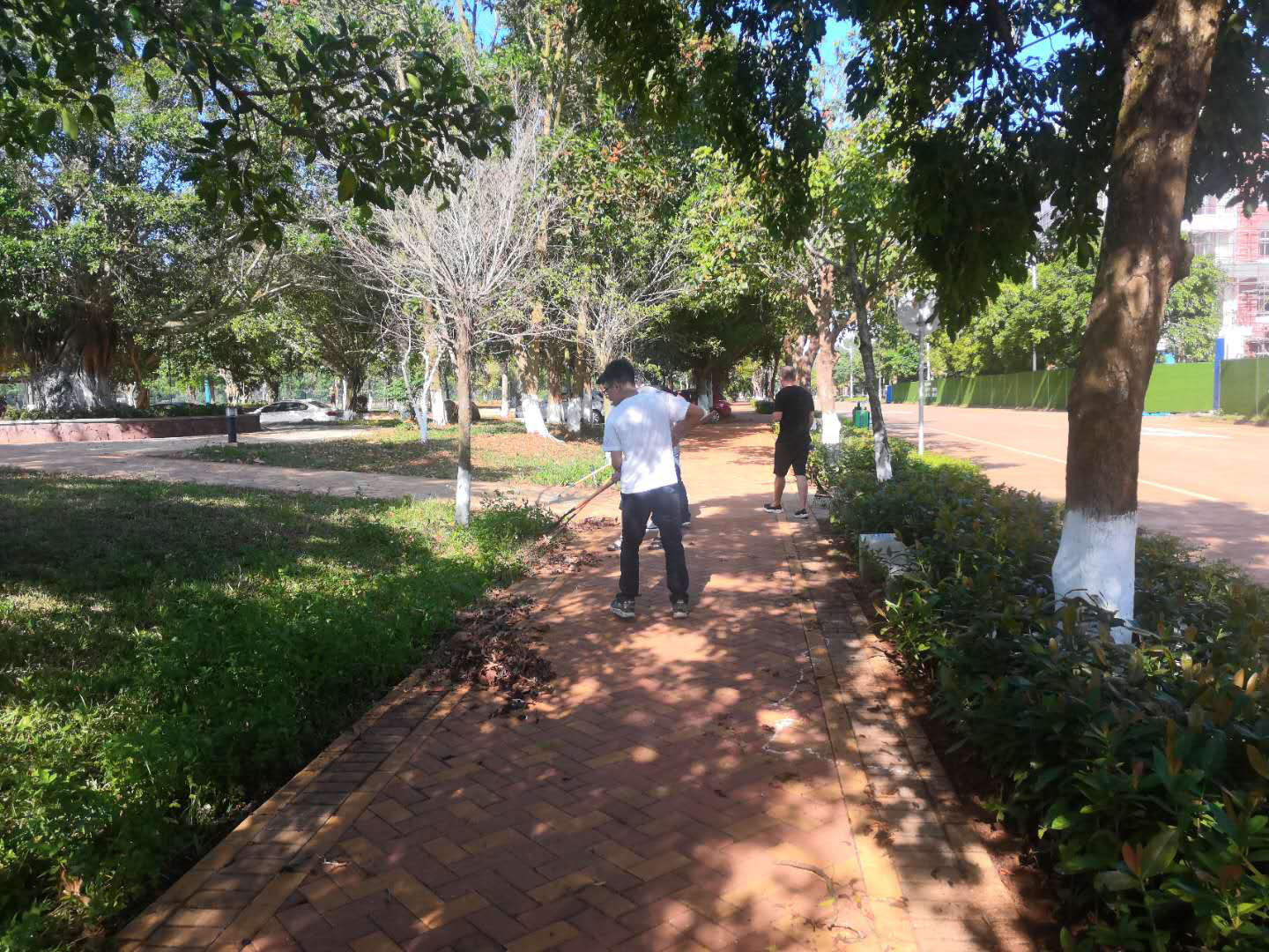 校园卫生主要清扫负责区域的白色垃圾、落叶、小碎石等,教室主要清洁地面、桌椅等,在36℃的高温天气下,老师们撸起袖子,有的清扫落叶,有的清理垃圾,有的打扫教室地面,有的整理教室桌椅,干得热火朝天、汗流浃背。清理过后,经贸北路干干净净,垃圾摆放整整齐齐。