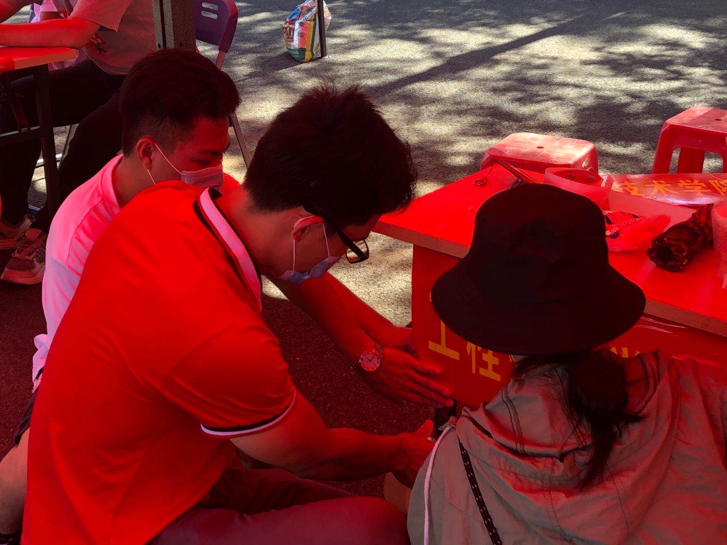 辅导员唐图和志愿者们布置工程技术公司接待站点