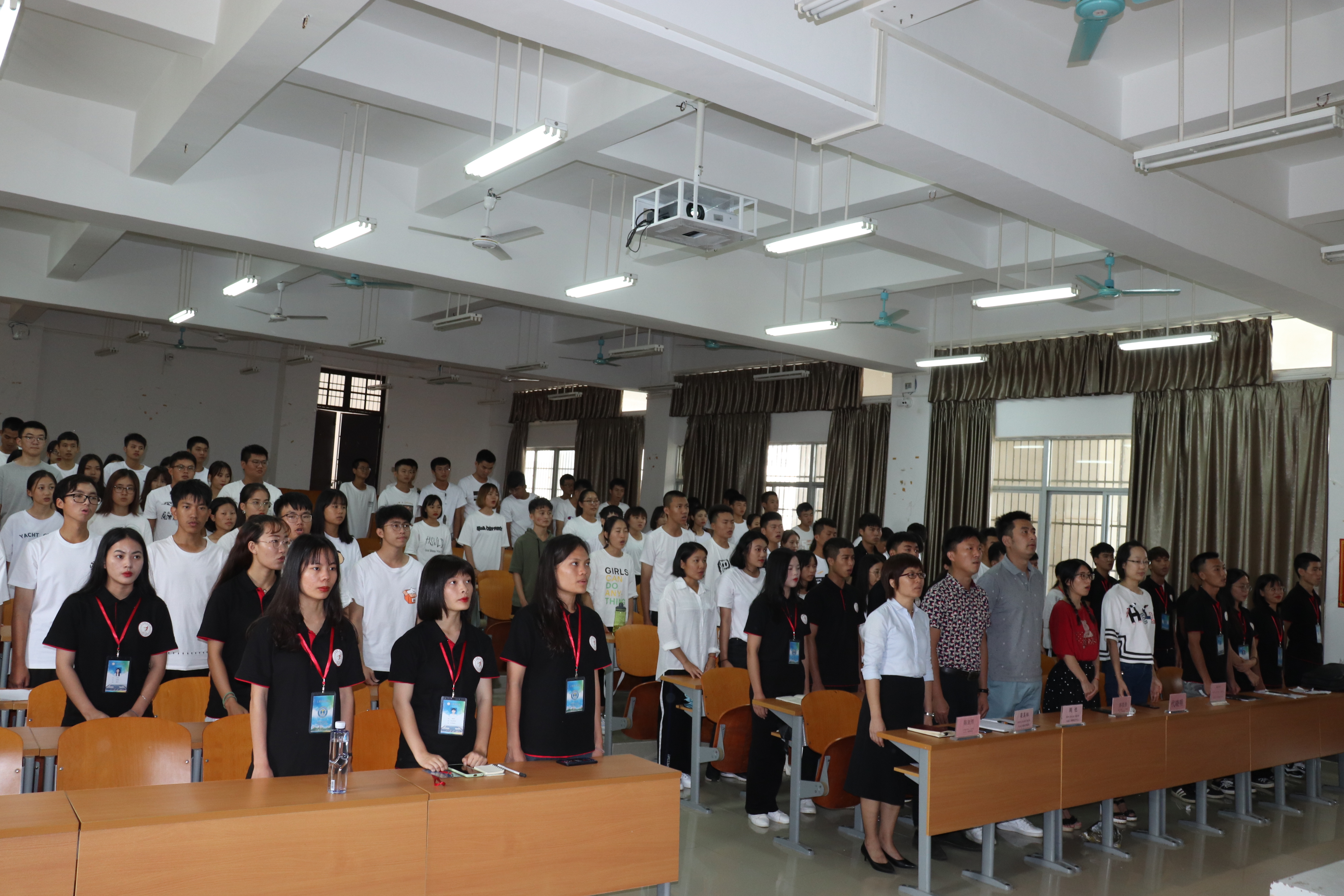 梁其钰、鄢兴祥、周恺老师依次上台讲话,指出“团学青是服务于全体员工的群众性组织,是一个服务性、奉献性的组织,是在同学们需要时,代表全体员工利益的组织;我们工程的员工工作一直做得比较好,这里面有领导的殷切关怀,更是与全体团学青成员的精诚合作、努力奋斗是分不开的,现在是在团学青转型的关键时期,我们新一届团学青不能吃老本,大家要团结协作,才能书写我们的成绩,做出我们的工科特色,展现团学青群体应有的风采”。最后,由叶俊男领誓,大会全体成员起立进行宣誓。