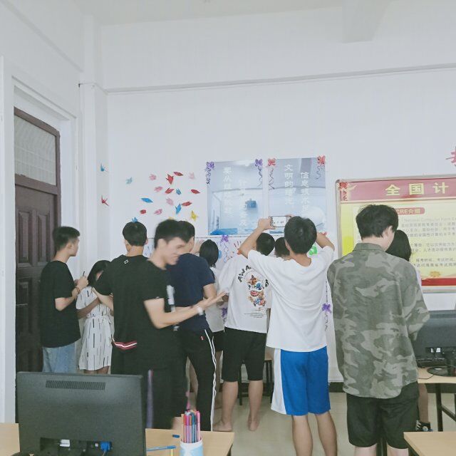 看,那些坐在地上同学们,他们正在构思着新的花样,他们不停地交流着,有时遇上难题时还会掏出手机百度看看有没有解决办法。大家一起动手其乐融融,为班级的文化布置工作奠定了最初的准备工作。看,同学们脸上露出的那一抹淡淡微笑,那是对新学期满满的期待和憧憬。教室里到处都能看到同学们忙碌的身影,忙得不亦乐乎。