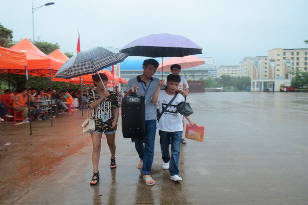 一个又一个的新生接踵而至,整个校园里雷声,雨声,人言声,声声入耳。在如此人雨繁杂的情况下,却在迎新者们的辛勤调解帮助下有条不紊地进行。天公不作美,冒雨迎新生;顶风涉水多壮志,敢叫狂雨变小雨。