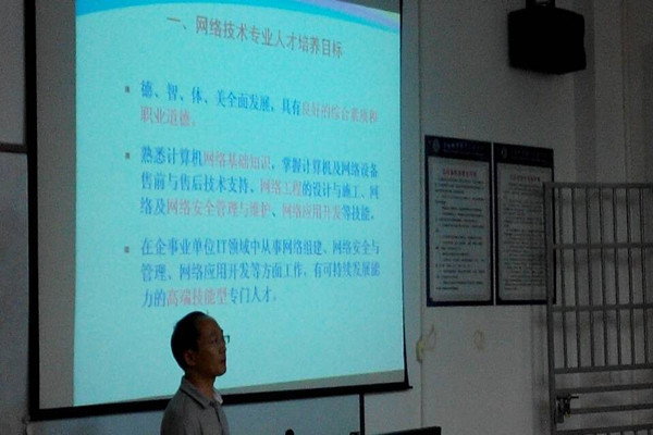 本系9月11日讯(信息技术系 钟超报道)按照公司制定的人才培养方案以及系部统一部署,信息技术系开展了一系列新生入学专业教育活动,9月9日晚上7:30分,计算机网络技术专业负责人王岩老师组织了新生专业教育活动,由专业负责人带领2014级新生到4-410教师,由王岩老师主讲,目的是让新生了解公司、了解系部、了解专业。