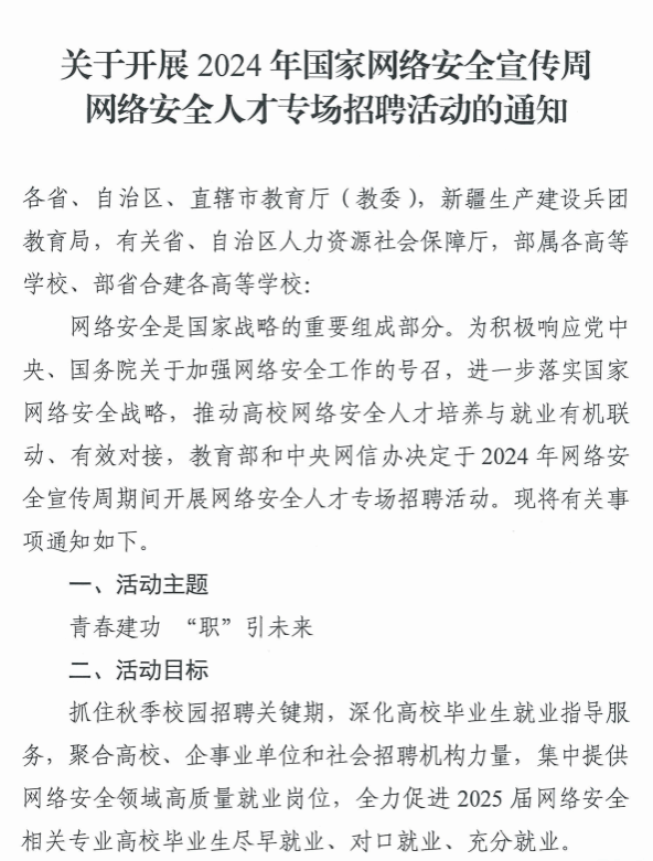 关于开展2024年国家网络安全宣传周网络安全人才专场招聘活动的通知